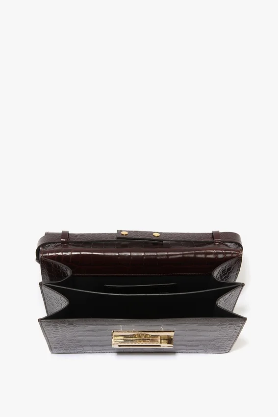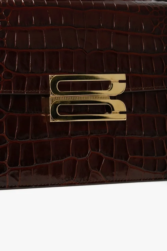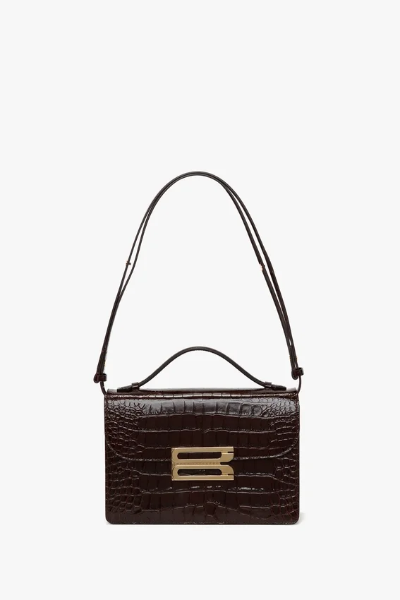 one of the house’s hero items, the dorian bag is defined by its clean lines and slender silhouette. crafted from luxurious dark brown croc embossed leather and embellished with the brand’s signature b buckle motif, this sophisticated accessory speaks to a multi-generational customer. featuring a removable and adjustable ‘smart strap’ and snap buttons, it can be worn as a shoulder or crossbody bag, while inside a double compartment and small flat leather pocket allow for secure storage. the dorian includes the discretely stamped address of victoria’s london studio (n.202) followed by a unique serial number.