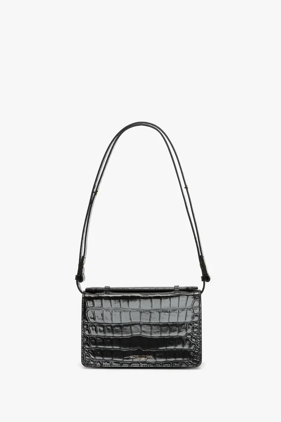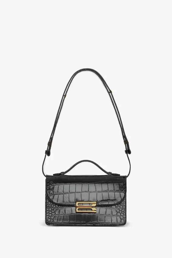 a reimagining of the house’s hero dorian bag, the small dorian in black croc-embossed leather is exquisitely crafted in italy from textured calf leather and finished with microsuede lining. it has a removable strap with snap buttons for styling as a shoulder or crossbody bag and a top handle for further versatility. featuring the house’s signature gold branding, which includes the discretely stamped address of victoria’s london studio (n.202) followed by a unique serial number, it is a dynamic option for everyday wear.