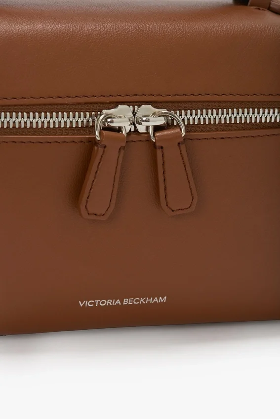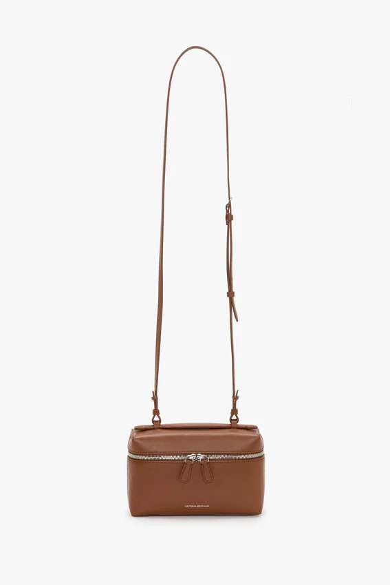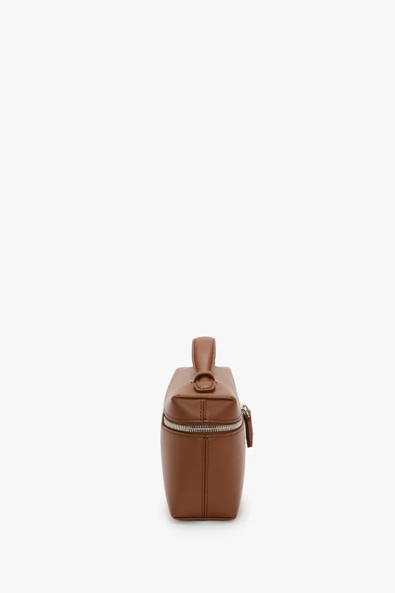 the dual purpose vanity crossbody cleverly doubles as a vanity case and a handbag. crafted from tan calf leather, it has a top handle and removable crossbody strap, plus an internal flat pocket and zip closure for secure storage.