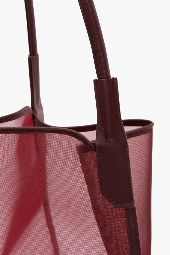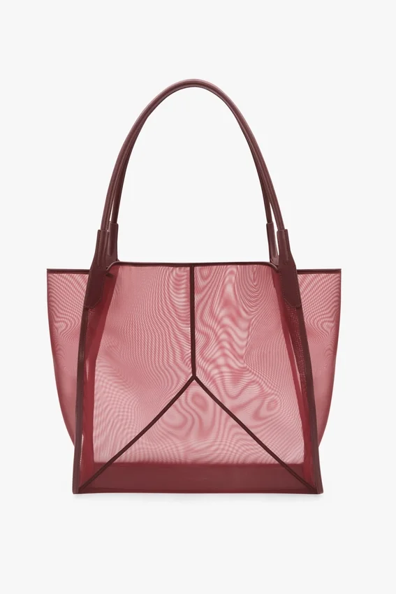 a fresh reiteration of the classic victoria tote, the large victoria tote in burgundy mesh is crafted from 100% polyamide and includes a removable flying pocket. defined by the same unstructured silhouette and clean lines as the original victoria tote, it expresses beautifully the house’s unique point of view.