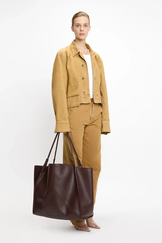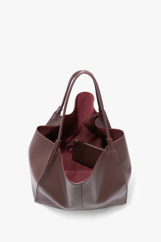 the butter-soft victoria travel tote bag in luxurious burgundy introduces a new design language to the house’s leather goods archive. with its exaggerated shape and unstructured silhouette, the victoria tote expresses a fluidity that is fresh and modern. simple lines and the absence of traditional hardware create a minimal aesthetic punctuated only by subtle v stitching on the front panels. the house’s signature gold branding, including a victoria beckham logo and unique serial code, are discreetly located inside the bag. wide leather straps and suede bonded lining complete the look.