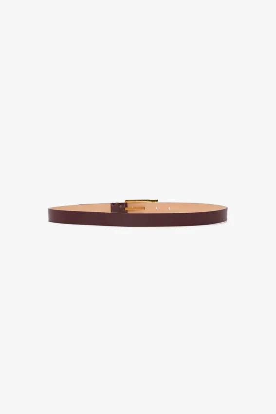 the dorian pin-buckle belt in burgundy is crafted in italy from calf leather and distinguished by its curved b buckle hardware. bringing sculptural elegance to an everyday utilitarian item, it embodies the house’s understated glamour.