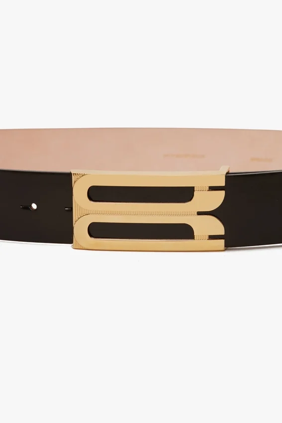 a favourite in the victoria beckham accessories archive, the jumbo dorian belt offers a contemporary twist on a wardrobe classic. meticulously made in italy from glossy black calf leather, it has a gold-plated b buckle detail for an elevated point of difference and is ideal for adding polish to utilitarian denim or pared-back separates.