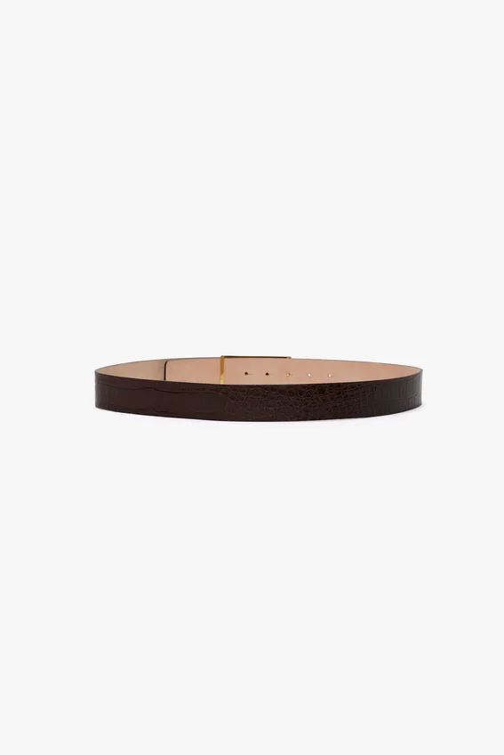 a croc embossed leather brings fresh energy to the jumbo dorian belt. with the widest silhouette in the dorian belt series, it adds a confident finishing touch to any outfit. crafted in italy from tactile grained leather and presented in versatile dark brown for ss25, it is embellished with the house’s signature gold-plated hardware.