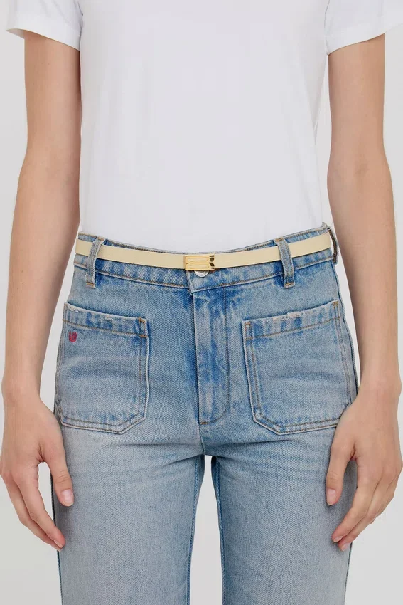 understated refinement is a hallmark of the victoria beckham brand and it’s embodied in the micro dorian belt. with its streamlined silhouette, tactile leather fabrication and elegant ivory colourway, it will add a polished finishing touch to utilitarian separates and masculine tailoring. featuring the house’s signature gold hardware, it is a foundational piece for any wardrobe.