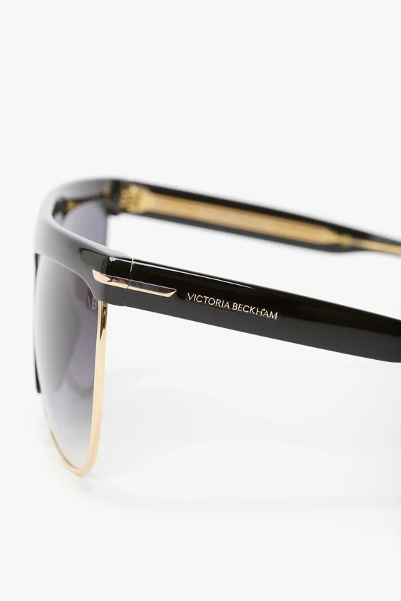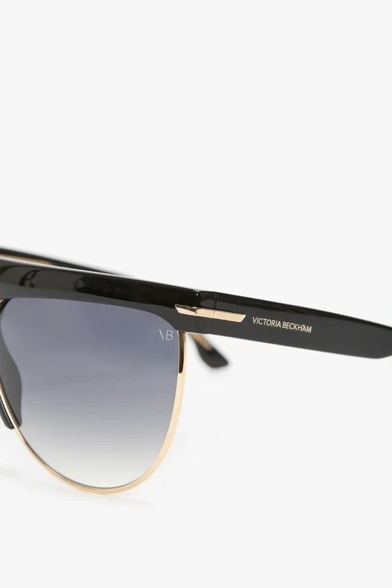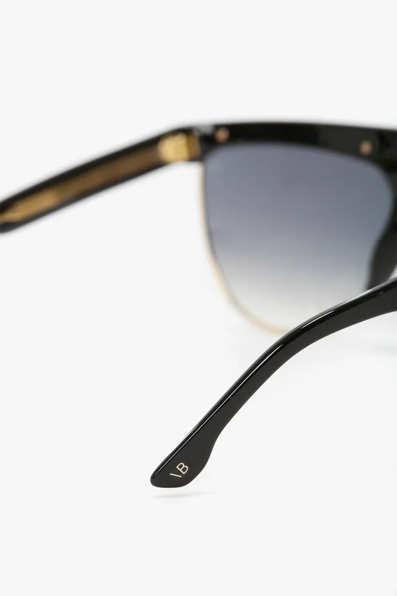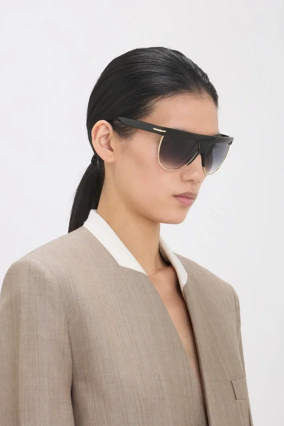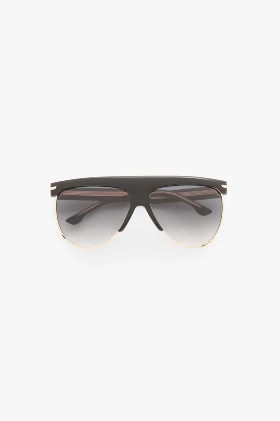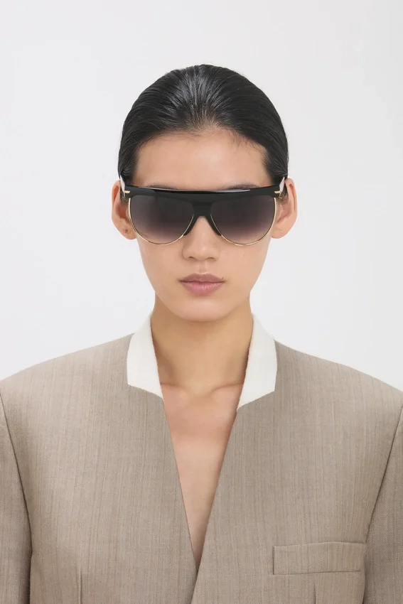 these soft wraparound drop-shaped acetate and metal sunglasses are presented in classic black with grey shaded lenses. a signature v-cut logo provides subtle embellishment.