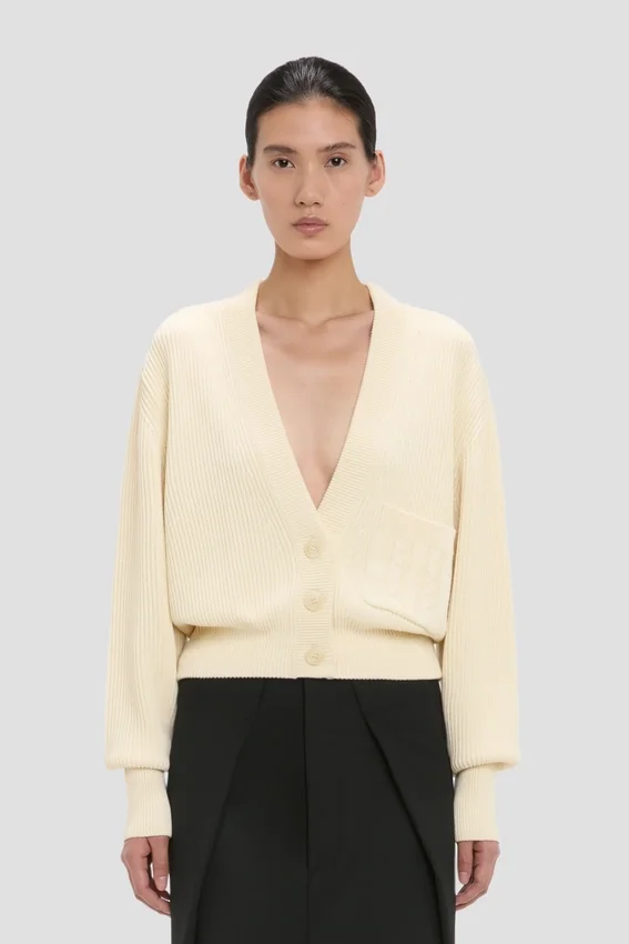 a traditional fisherman’s stitch brings a tactile finish to the cotton-blend cable pocket cardigan in ivory. designed with a low-front v-neck, cropped hemline and pleated back, it has a subtly feminine silhouette.