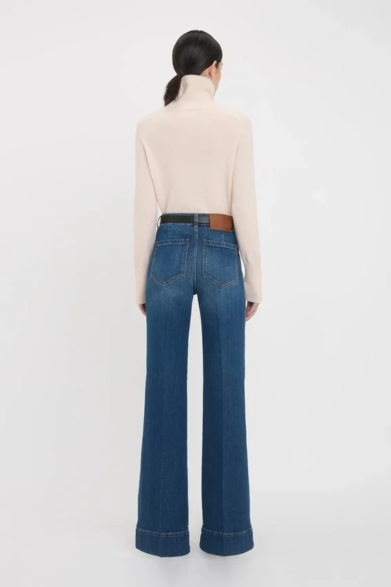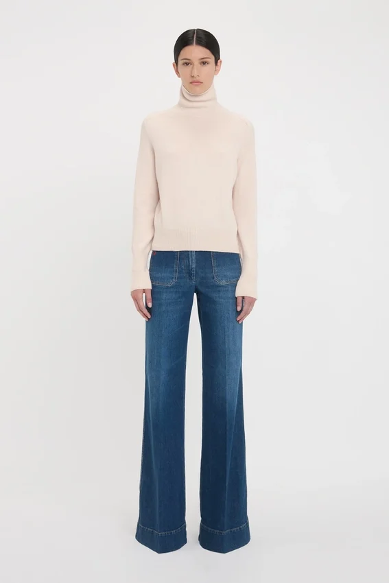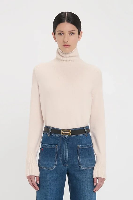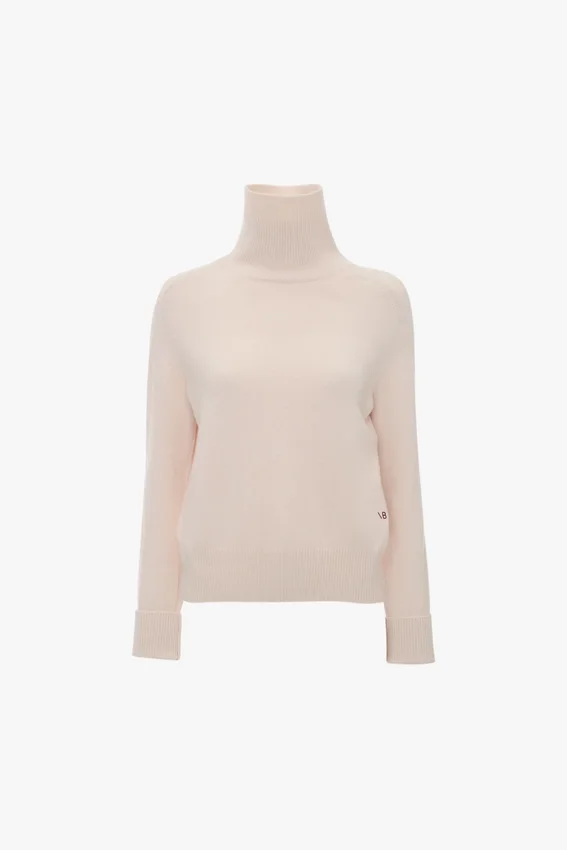 the classic polo neck is reframed with contemporary detailing including a saddle shoulder, ribbed neckline and embroidered victoria beckham monogram. made from a velvety lambswool, it can be worn with the neck folded over, or upright for a more dramatic look.