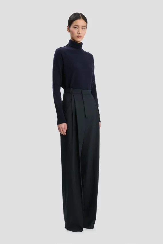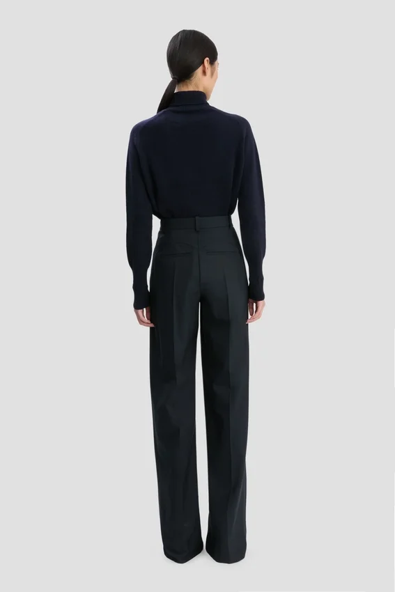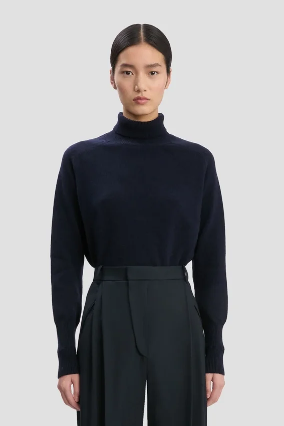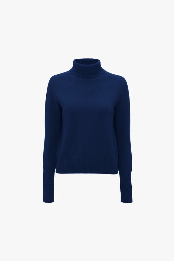 created in an endlessly versatile shade of navy, this lambswool polo neck has a saddle shoulder design and contrasting ribbed neck, which can be folded over or worn upright for versatile styling options. a contrasting embroidered victoria beckham monogram adds a discrete design detail.