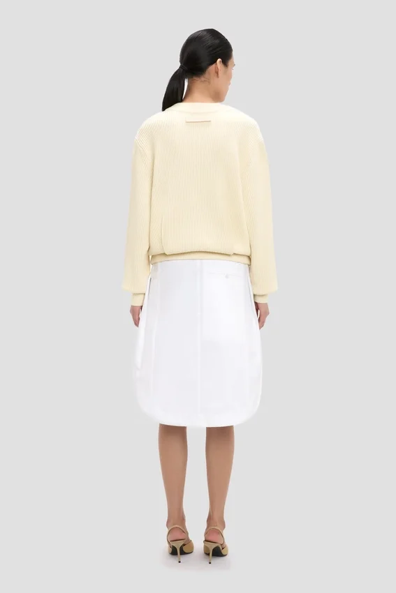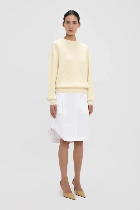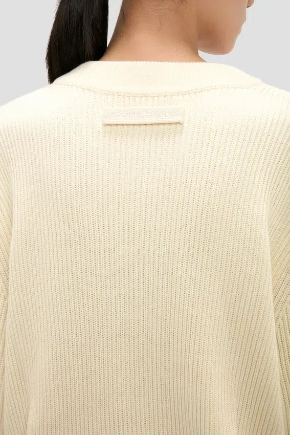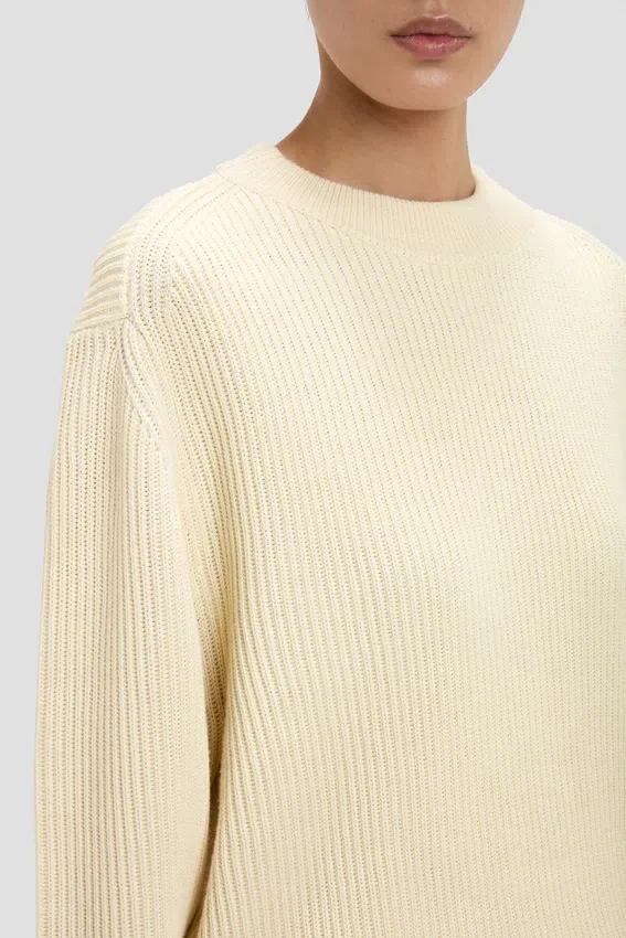 designed with a tactile fisherman’s stitch, the relaxed fit jumper in ivory has a rounded neckline, high hip hemline and long sleeves with cuffs. a pleated back adds subtle structure to the silhouette, while the cotton-blend fabrication is comfortable and breathable.
