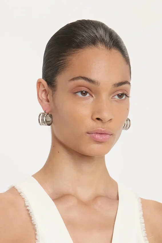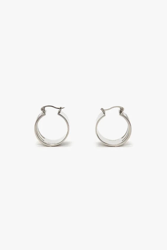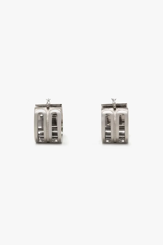 the classic hoop earring is elevated with the house’s signature b frame detail. exquisitely crafted from brass in italy, the dorian hoop earrings are designed to elegantly frame the face. presented in a sleek shade of silver, they are a wear-anywhere accessory.