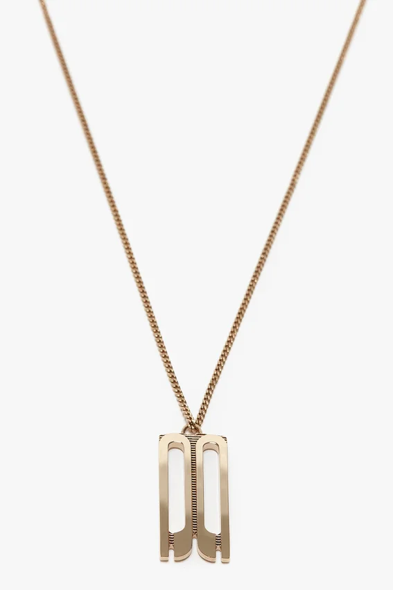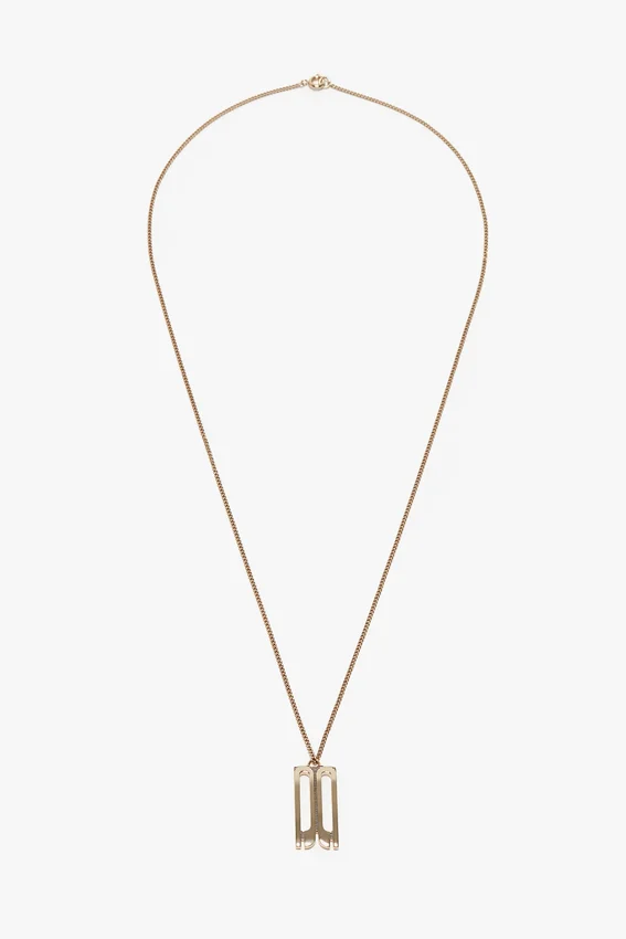 new to the victoria beckham accessories edit is the elegant dorian charm pendant. designed around the house’s signature frame detail, it is rectangular in shape with a fine chain that passes through the pendant’s eyehole. crafted in italy from gold-plated brass, it is finished with an engraved victoria beckham logo and a spring ring clasp for secure closing.