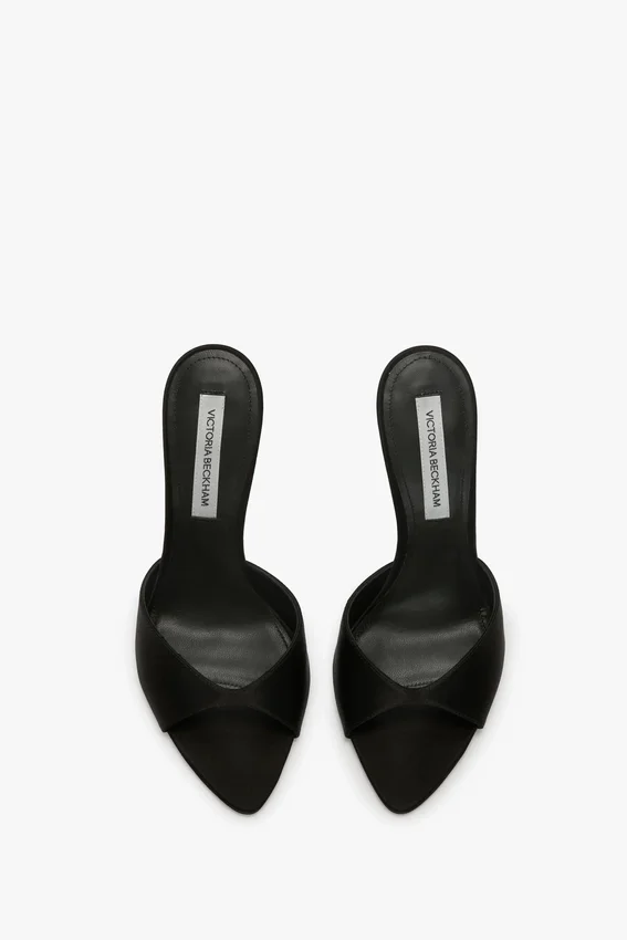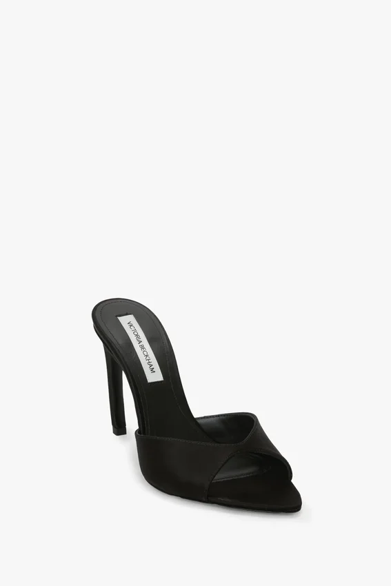 an almond-shaped open toe and sculptural 100mm curved heel give theharlow open toe mule in black satin a distinctive personality. finished with leather lining and a padded insock for absolute comfort, it has a subtly sexy appeal.