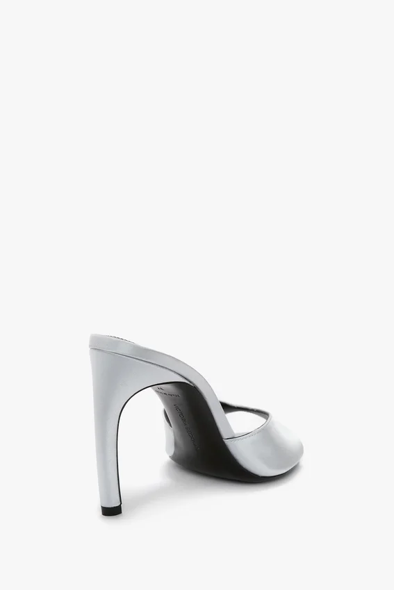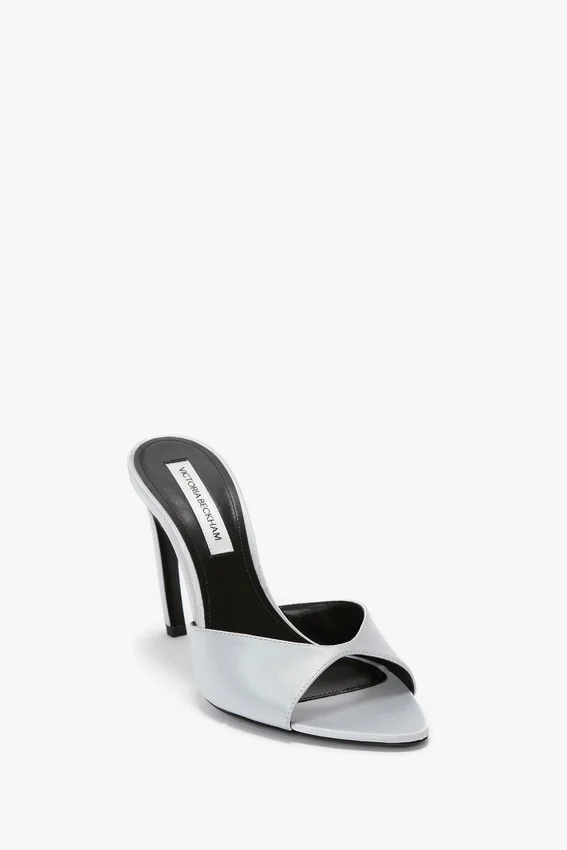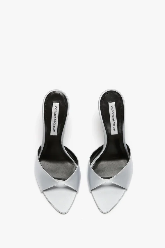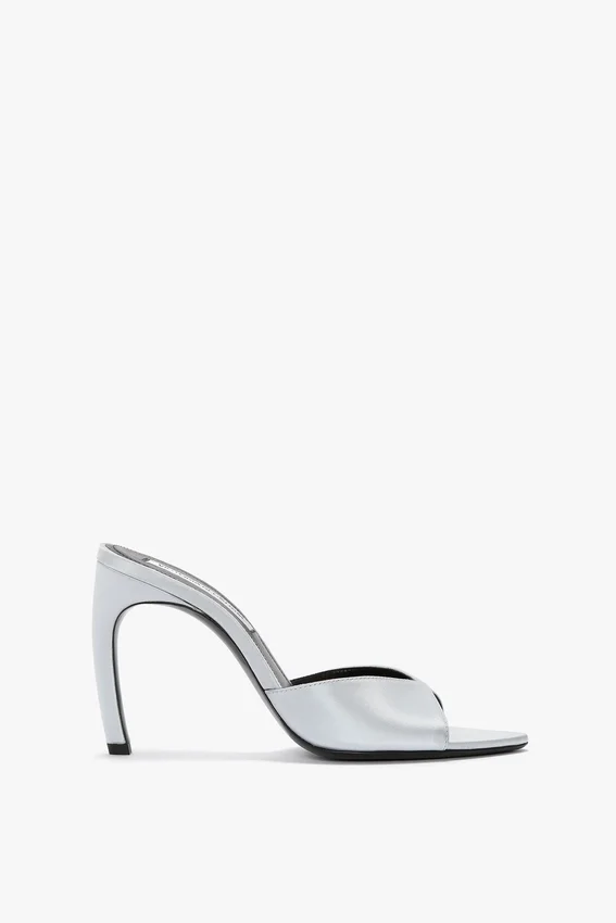 an almond-shape open toe and sculptural 100mm curved heel give the harlow mule a distinctive personality. presented in magnesium with a satin upper and finished with leather lining and a padded insock, it has a subtly sexy appeal.