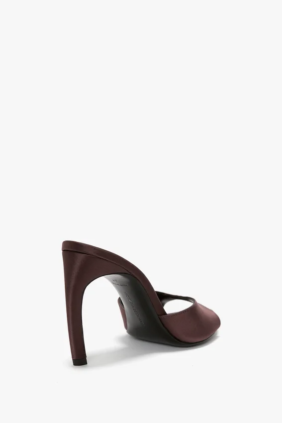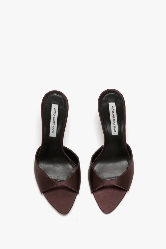 an almond-shape open toe and sculptural 100mm curved heel give the harlow mule a distinctive personality. presented in maroon with a satin upper and finished with leather lining and a padded insock, it has a subtly sexy appeal.