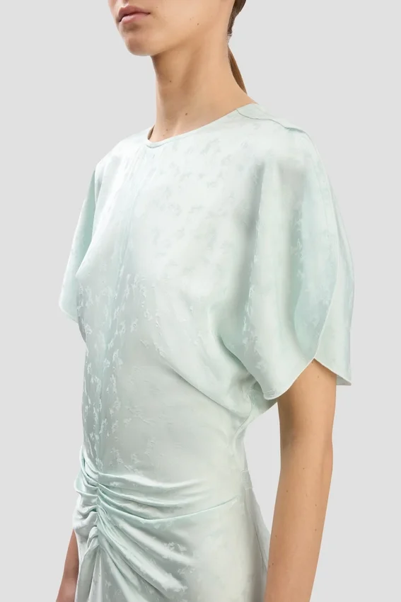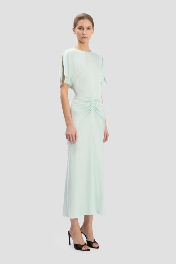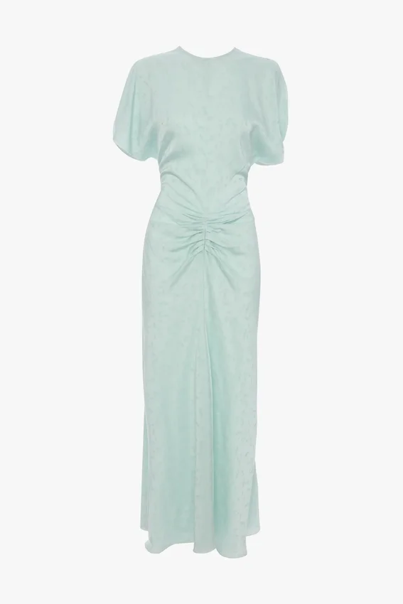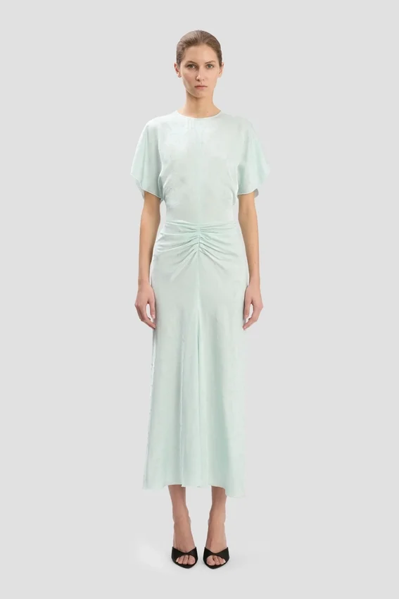 immaculately cut in a classic fit-and-flare silhouette, the bela midi dress has a gathered front, tulip sleeve detail and slight v-neck at the back. reimagined in a tactile jacquard fabric and presented in a subdued shade of aquamarine, it embodies understated elegance.