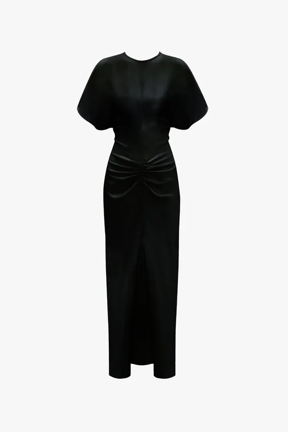 reimagined in universally appealing black, this elegant bela midi dress has a gathered front, tulip sleeve detail and slight v-neck at the back. immaculately cut to accentuate the waist in a classic fit-and-flare silhouette, the bela midi dress is rooted in femininity and exudes a modern refinement.