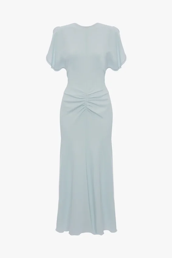 The house’s signature Bela Midi Dress is crafted from crepe back satin and is fitted at the hips with a flared skirt for a beautifully feminine silhouette. Front and back pleat details add tactile talking points, while side seams with a contrasting topstitch bring an elevated finishing touch. A new Glacial Blue colourw