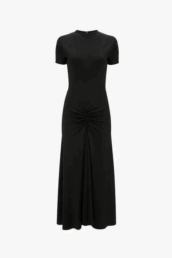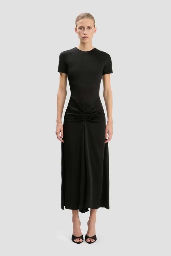 crafted in stretch jersey for a body-skimming effect, the blaire dress has a modest silhouette with round neckline and midi-length hemline. a v-shape seam at the waist with ruching brings a tactile point of difference, while the classic black colour-way imbues this dress with wear-anywhere appeal.