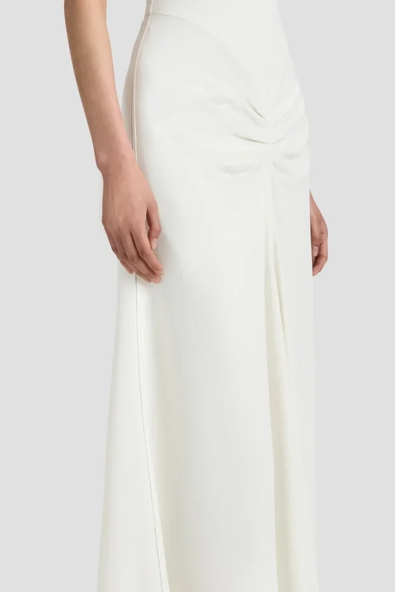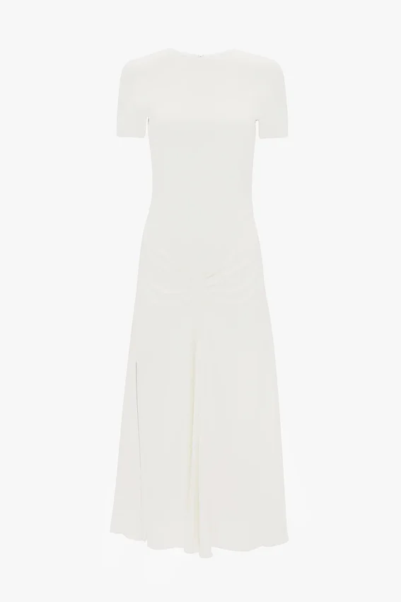 taking references from the house’s signature t-shirt dresses and hallmark midi styles, the blaire midi dress in ivory has a fitted bodice and a fluid, front-pleated skirt with longer-length hem at the back. a front v-shape waist seam adds definition to the silhouette, while the elegant shade of ivory brings a romantic refinement.