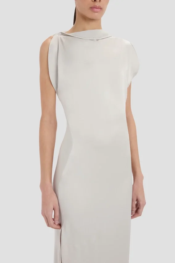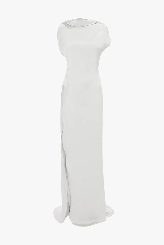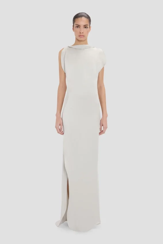 a floor-pooling hemline with long back train brings quiet drama to the carla gown. presented in refined magnesium, it is crafted from crepe back satin for a sensuous, figure-flattering drape, while a provocative side split brings a sexy undertone.