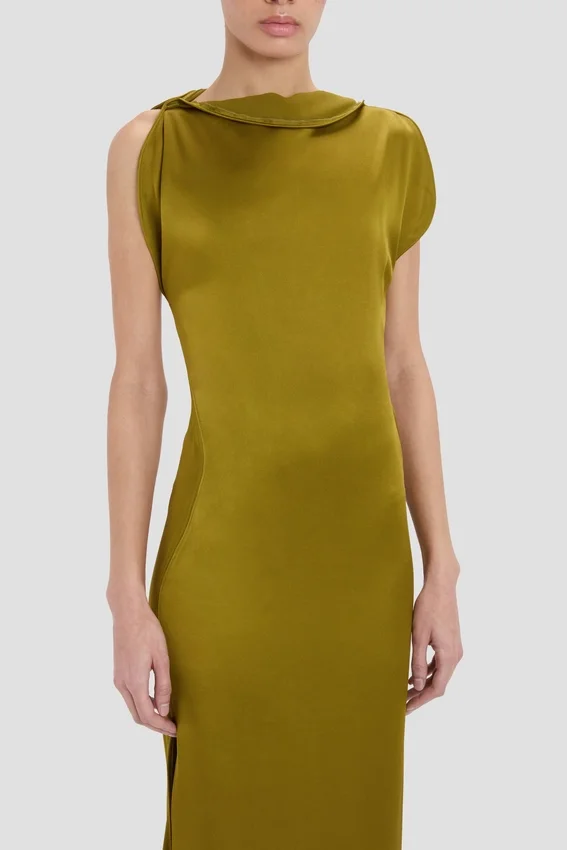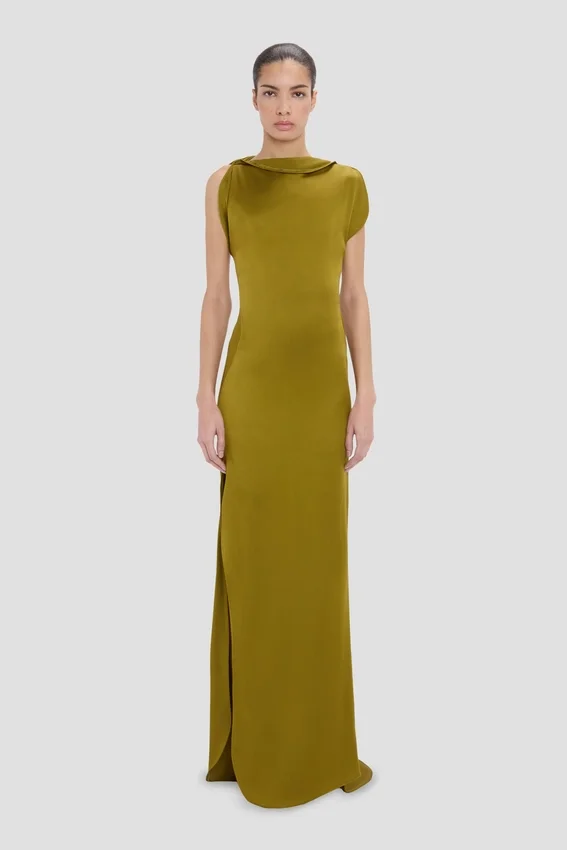 a floor-pooling hemline, provocative side split and long back train brings quiet drama to the carla gown. presented in understated moss, it is crafted from crepe back satin for a sensuous, figure-flattering drape and embodies the house’s understated glamour.