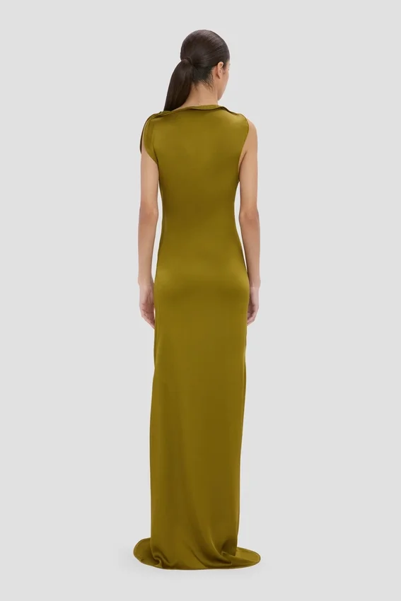 A floor-pooling hemline, provocative side split and long back train brings quiet drama to the Carla Gown. Presented in understated Moss, it is crafted from crepe back satin for a sensuous, figure-flattering drape and embodies the house’s understated glamour.