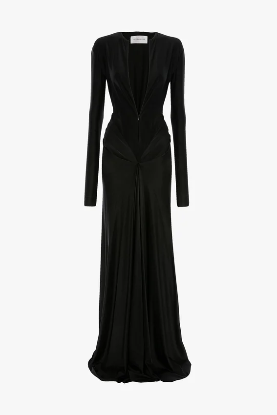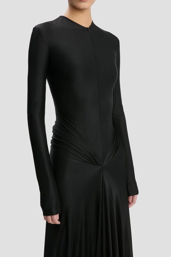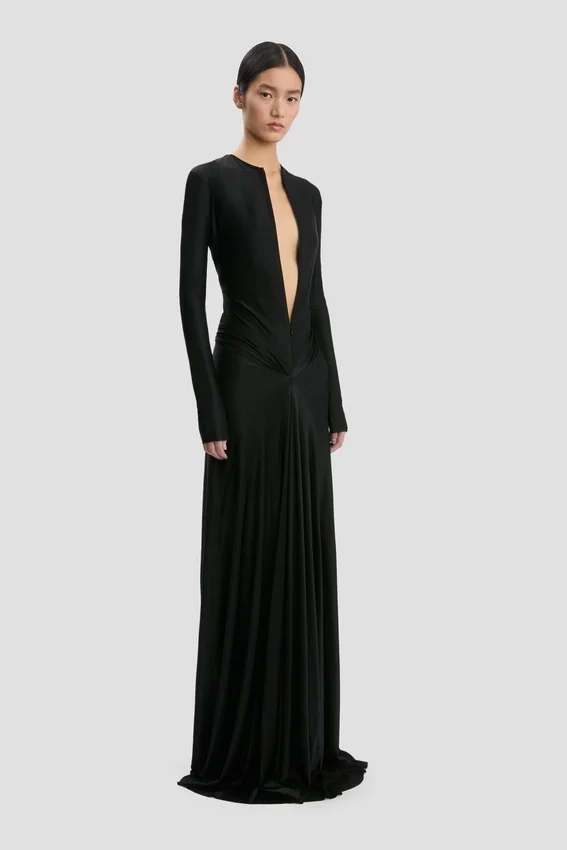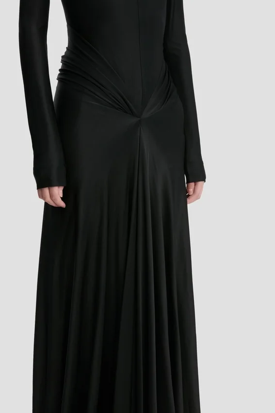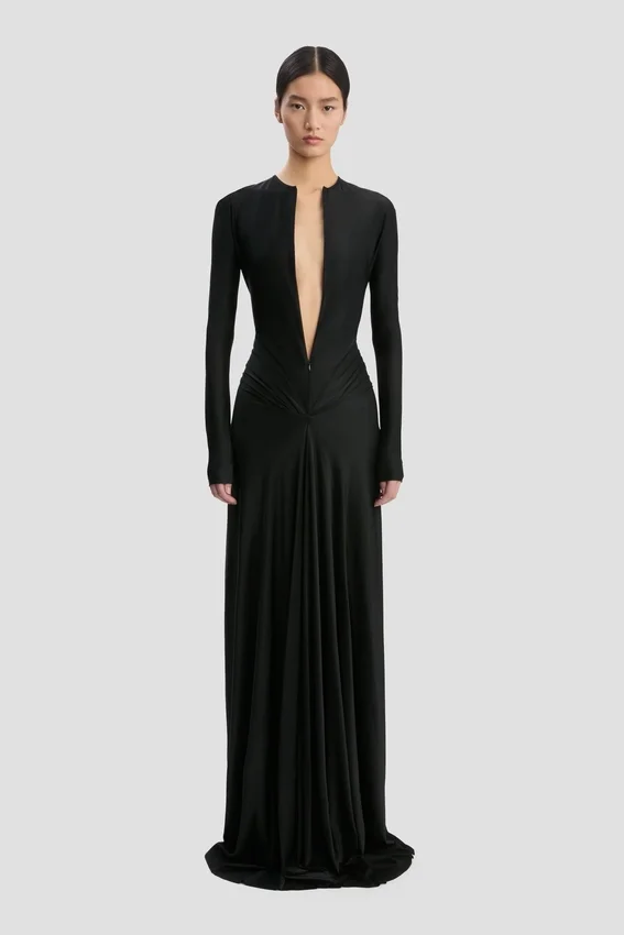crafted from a high-shine stretch jersey, the cut-out gown in black marries sophistication and provocation. defined by a round neckline, extra-long sleeves and floor-pooling hemline, its modest silhouette is punctuated by a tactile twisted detail with cut-outs at the back bodice, while a front zip fastening allows for a customizable neckline fit.