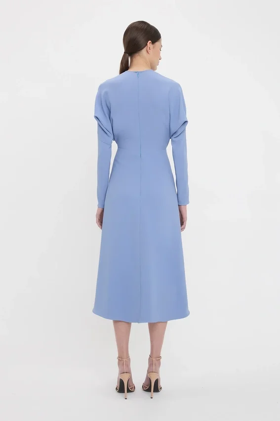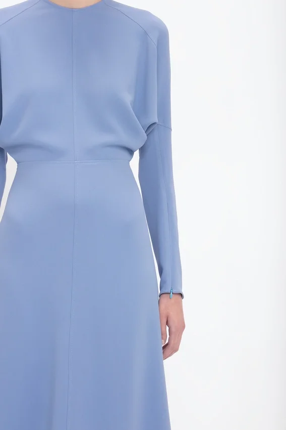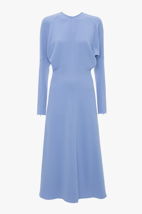 the house’s signature dolman midi dress is refreshed in a delicate shade of bluebell for ss25. crafted from a fluid cady fabric for a refined silhouette, it has modest long sleeves, a discreet round neckline and elegantly defined waist. concealed zips at the wrist and a voluminous underarm drape add a contemporary sophistication, while tonal topstitching brings visual interest.