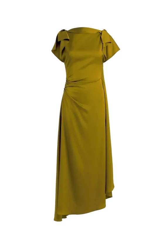 the draped midi dress is defined by a tactile draped neckline and front ruching. it has a midi-length asymmetric hemline and cap sleeves for a demure but discreetly directional silhouette. presented in understated moss, it is effortlessly elegant.