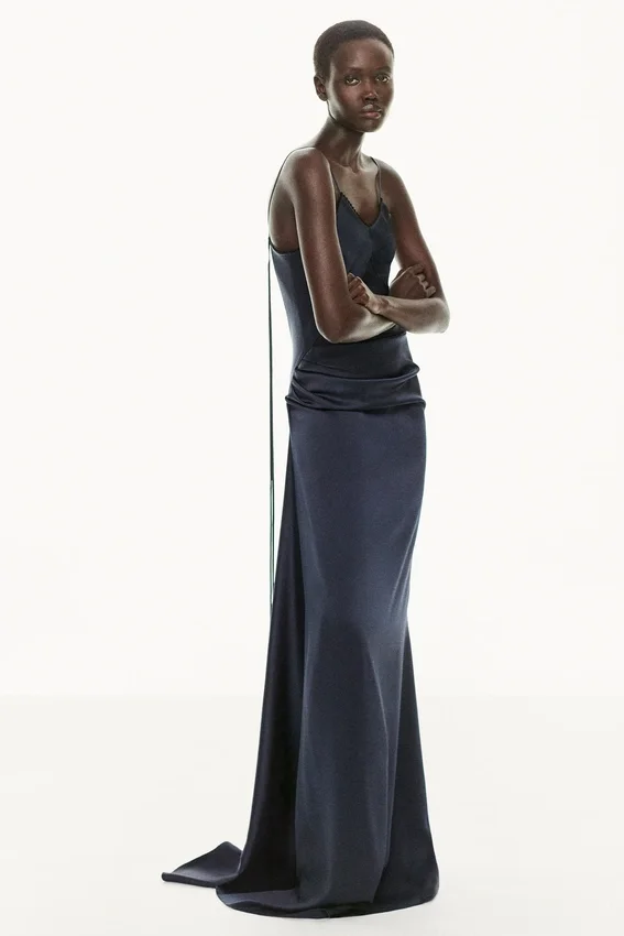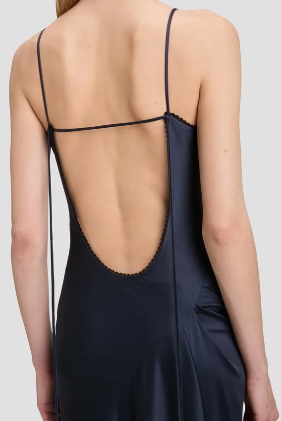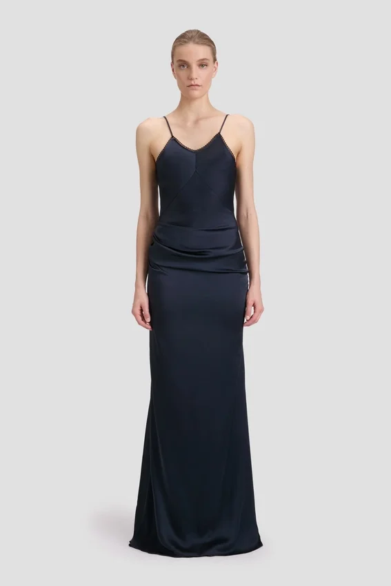 a sophisticated evening gown, the lace trim gather detail cami gown in midnight is unapologetically glamorous. defined by a scalloped lace‑trim neckline and subtle gathering at the hip, it skims the body and pools at the floor for a confident silhouette. presented in a deep midnight hue, it reflects the house’s refined take on evening wear.