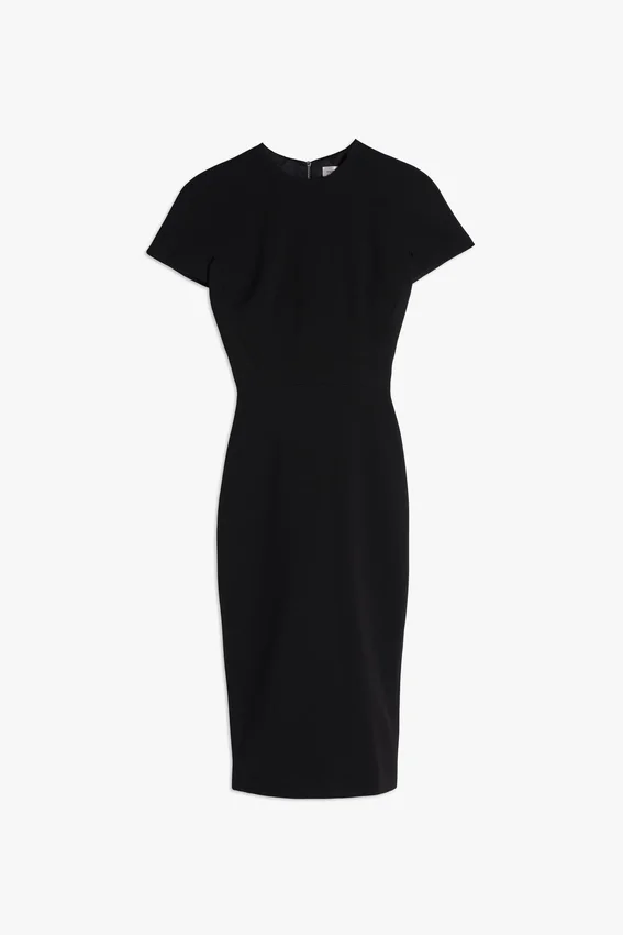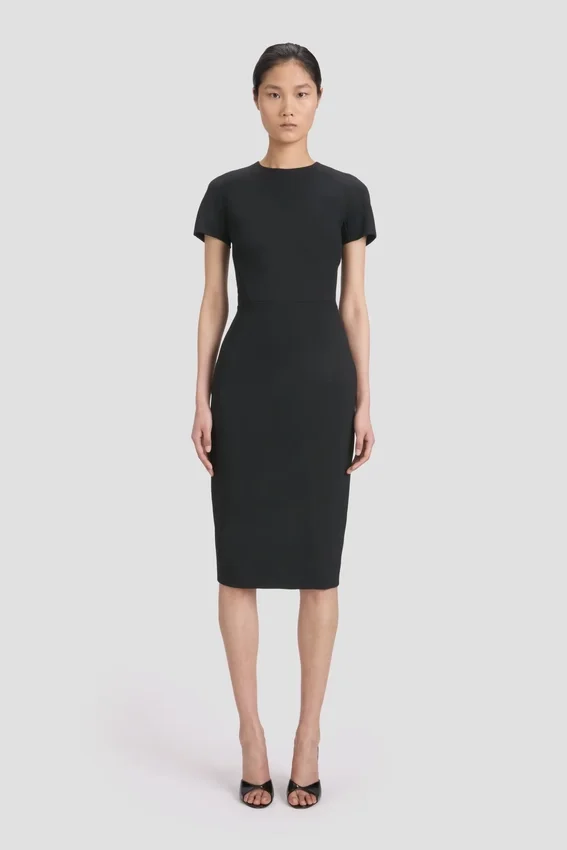 inspired by the simplicity of a t-shirt, the fitted t-shirt dress brings a fresh approach to one of the brand’s signature fitted shapes. a matte, bonded crepe fabric offers a narrow, flattering fit, while a high neck and midi hemline create an elongated silhouette.