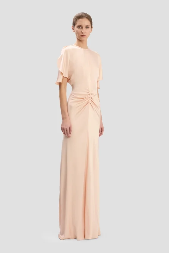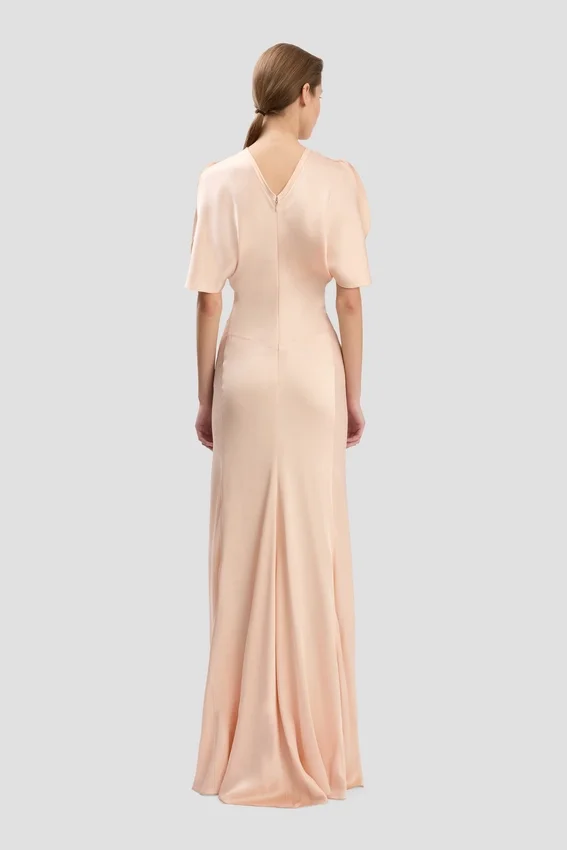 the popular isabella gown is reimagined in a delicate shade of blossom. cut to fit and flatter the upper body before pooling into a floor-grazing hemline, it has a modest round neckline, blouson sleeves and an v-shape back. front pleating adds a tactile finishing touch.
