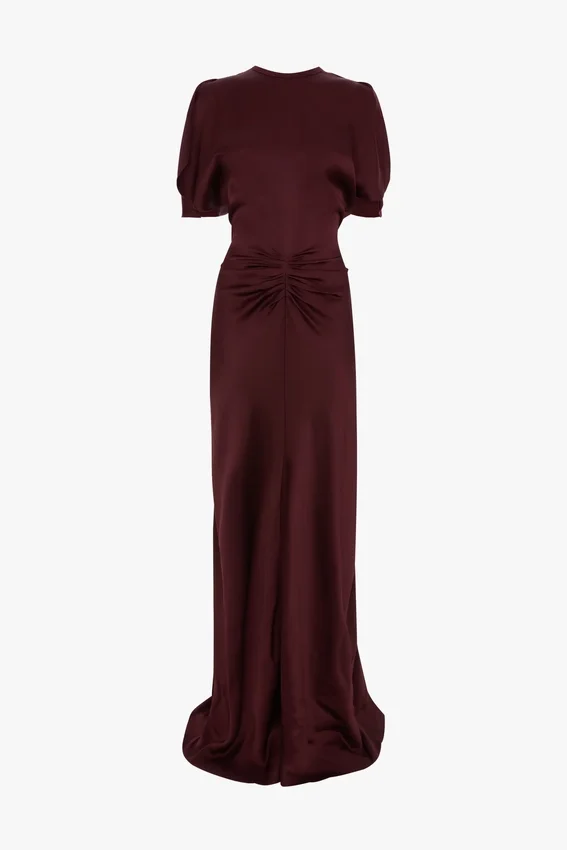 with its demure round neckline and floor-pooling hemline, the isabella gown makes a quietly confident statement. crafted in crepe back satin and presented in burgundy, it has a v-shape back neckline, pleated detail at the front waist and tonal topstitching at the back waist and side seams.