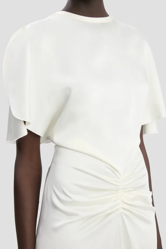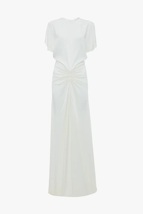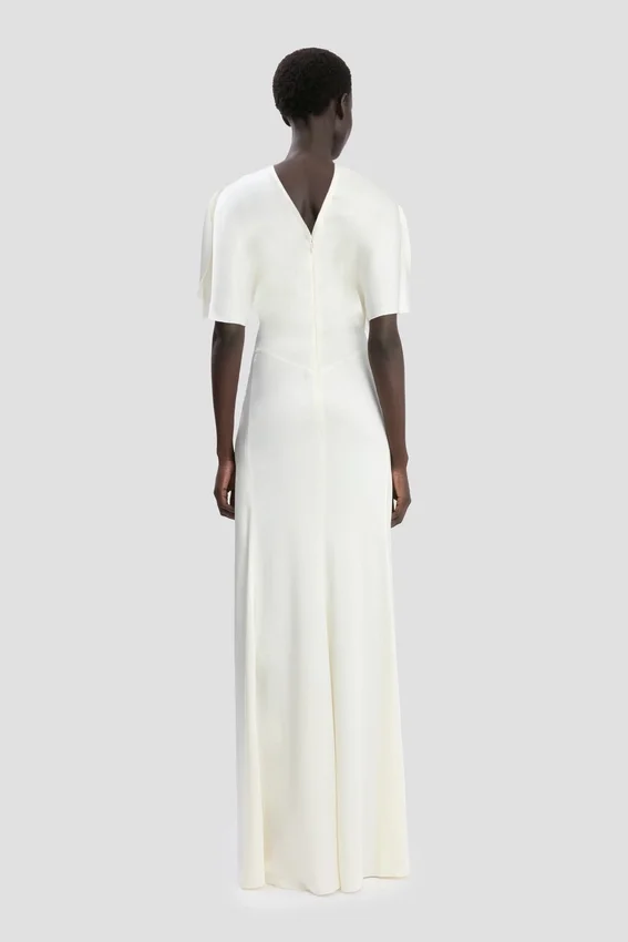 reimagined in a nostalgic shade of ivory, the isabella dress is a romantic proposition for the new season. crafted from luxurious crepe back satin, it is fitted at the waist and hip for a flattering hourglass shape. a floor-pooling hemline adds a dramatic finishing touch.