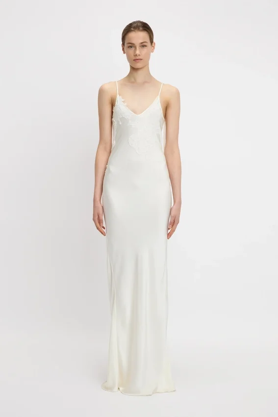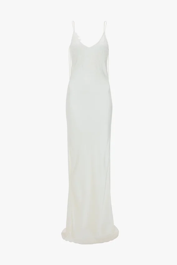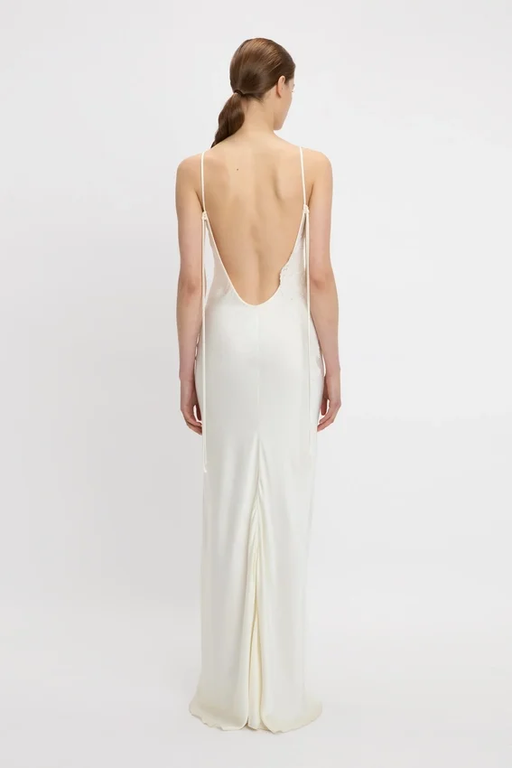 crafted from crepe back satin, this camisole-style evening dress has a bias cut for a figure-flattering drape. resonant of 1990s slip dresses, the lace detail cami dress in romantic ivory has a low back, thin spaghetti straps and playful tie details on the back of each strap. finished with a romantic lace appliqua detail, it reflects the house’s understated elegance.