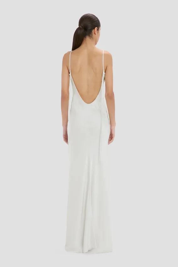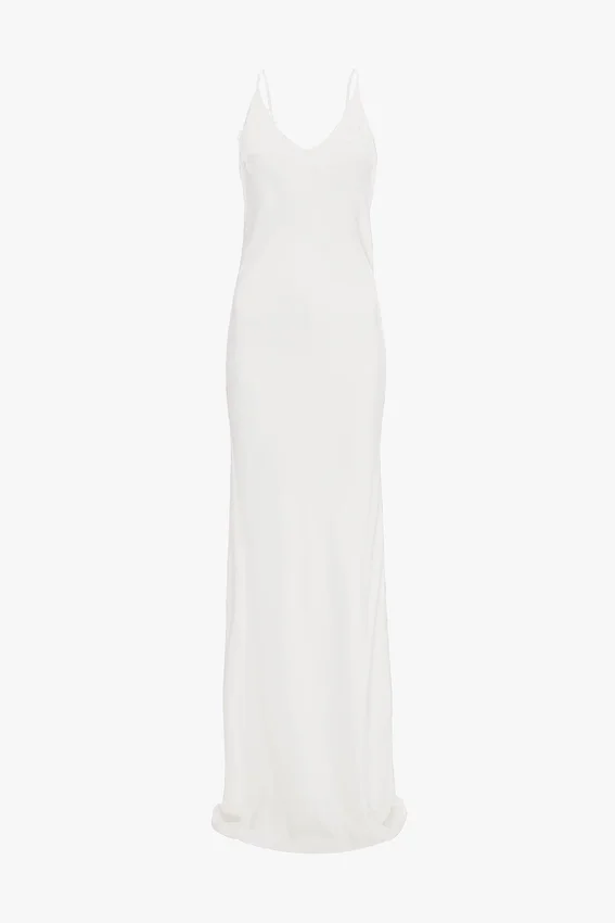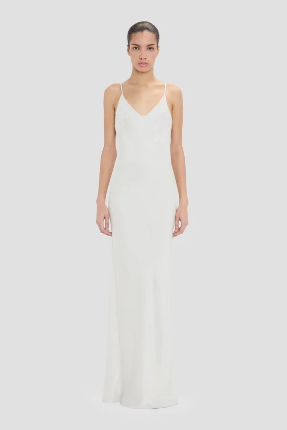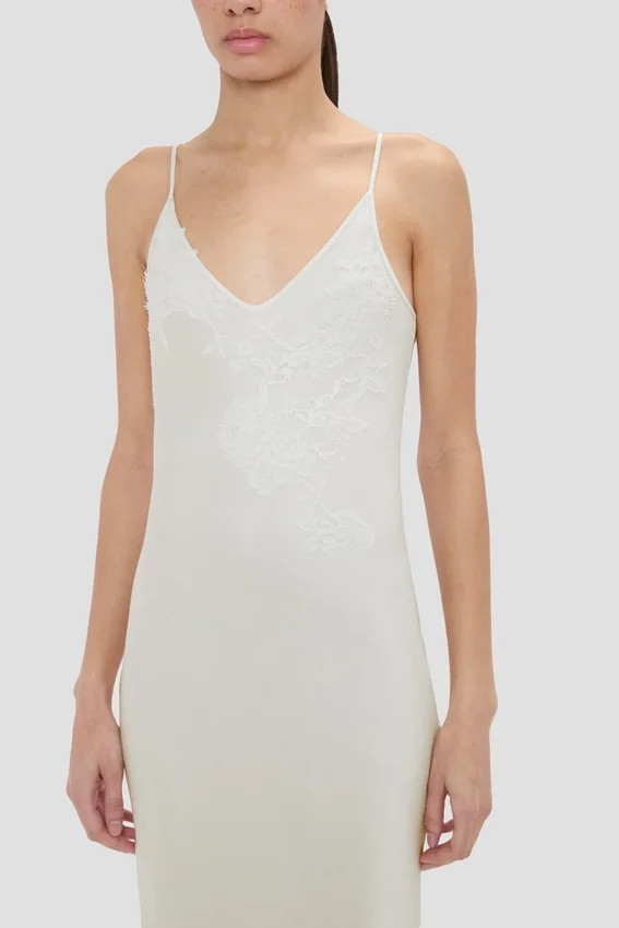 a tactile lace detail brings a feminine sensibility to the sensuous 1990s-inspired camisole slip dress. crafted from crepe back satin, the lace cami dress has a floor-length hemline, front v neckline and v-shaped back. presented in refined magnesium, it is a timeless piece of ready-to-wear.