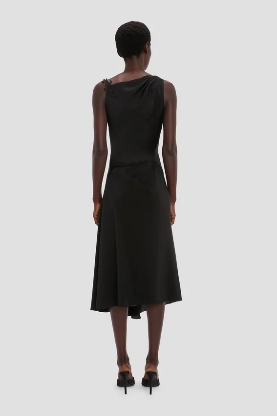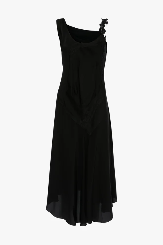 crepe back satin brings a figure-flattering drape to the lace detail dress. it has a deep rounded neckline, ankle-length cut and asymmetric hemline. a lace trim detail brings discreet decoration to this elevated lbd.