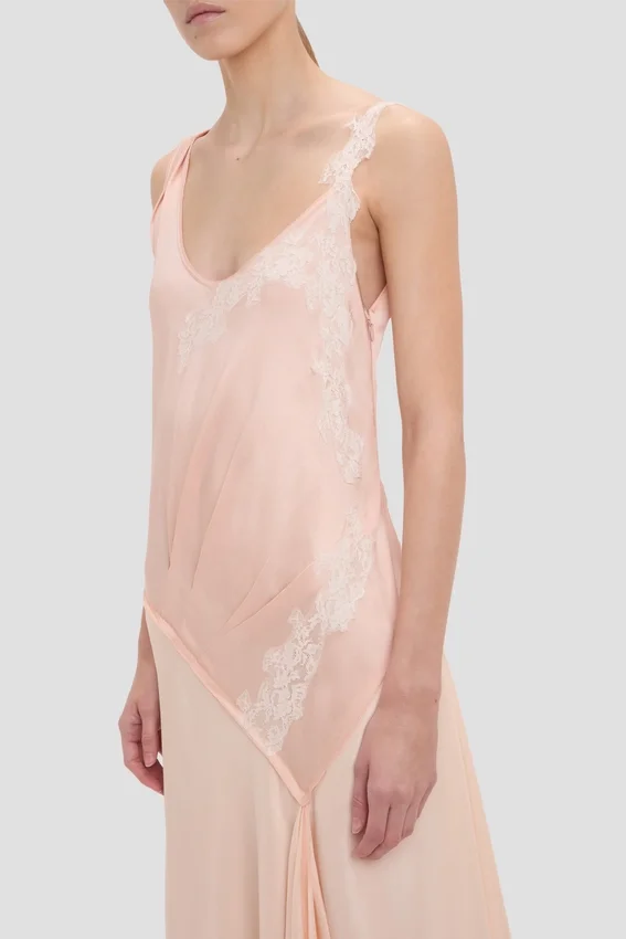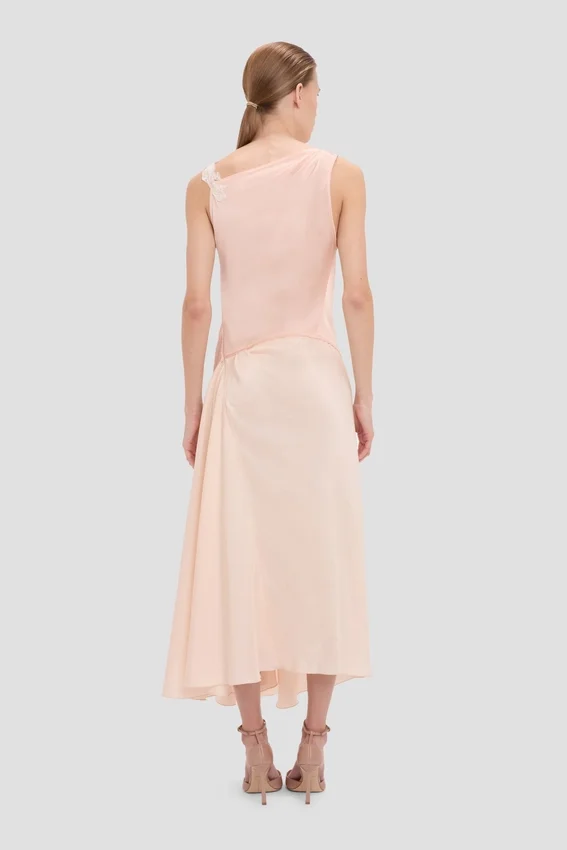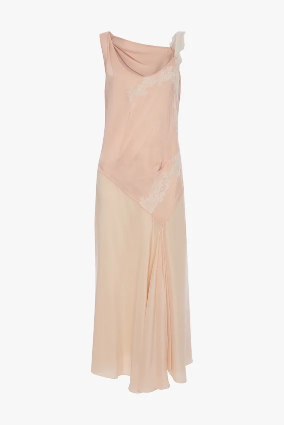 crepe back satin brings a figure-flattering drape to the lace detail dress. it has a deep rounded neckline, ankle-length cut and asymmetric hemline. a lace trim detail adds a discreet decoration and the tender shade of blossom brings a romantic sensibility.