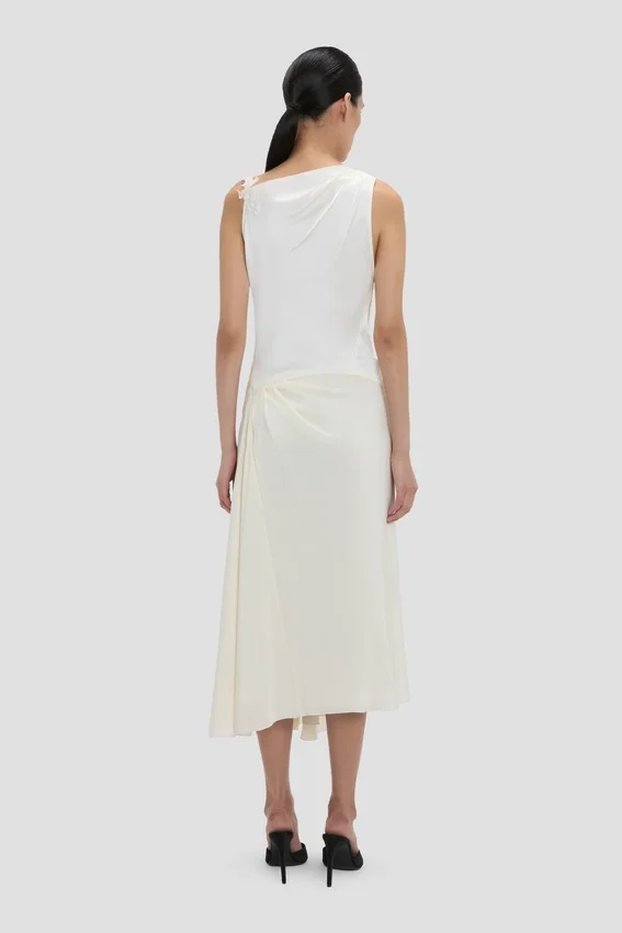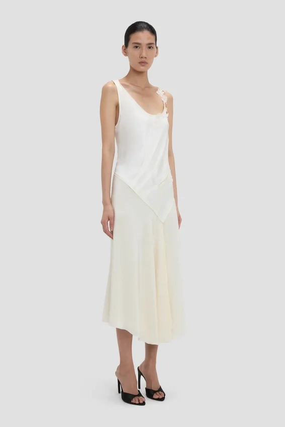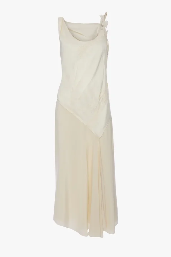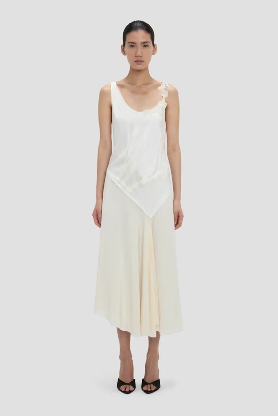 Crepe back satin brings a figure-flattering drape to the Lace Dress. It has a deep rounded neckline, ankle-length cut and asymmetric hemline. A lace trim detail adds a discreet decoration and the nostalgic shade of Ivory brings a romantic sensibility.