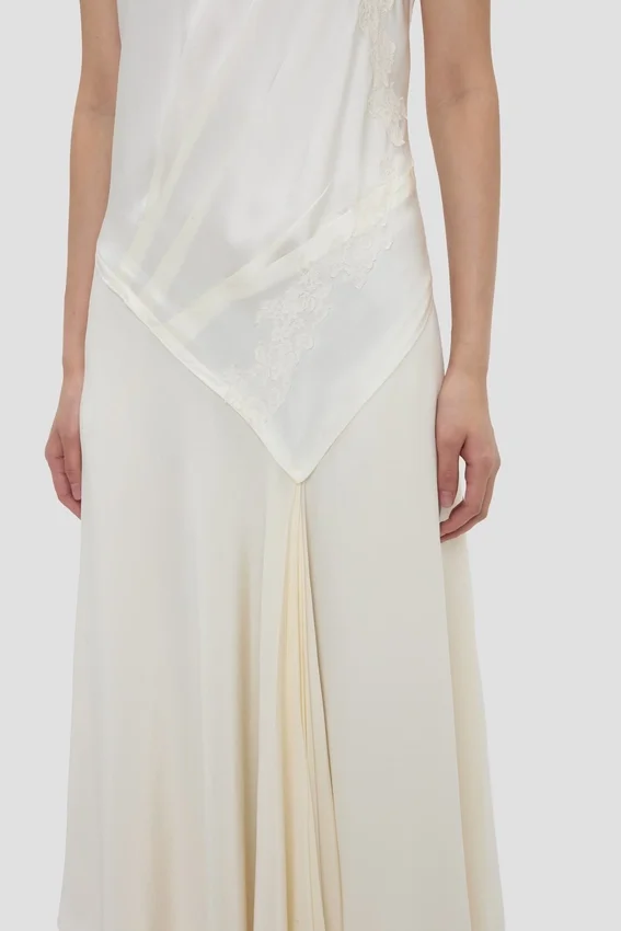 crepe back satin brings a figure-flattering drape to the lace dress. it has a deep rounded neckline, ankle-length cut and asymmetric hemline. a lace trim detail adds a discreet decoration and the nostalgic shade of ivory brings a romantic sensibility.