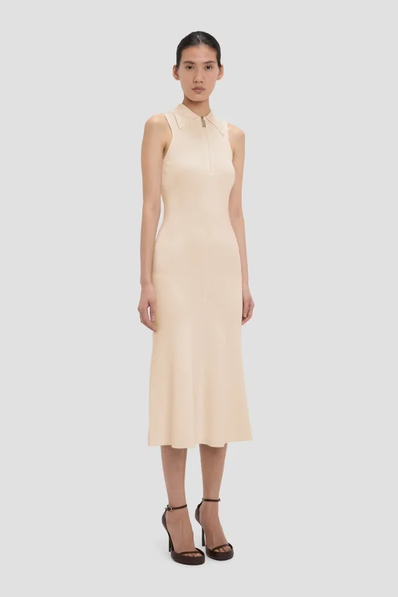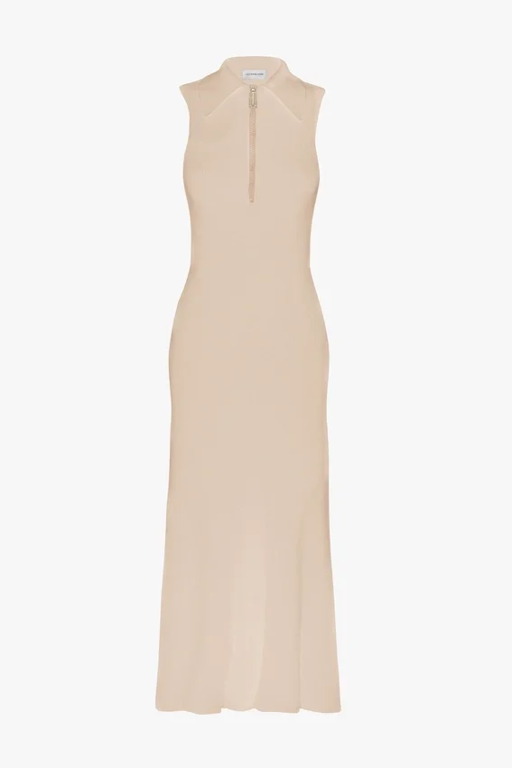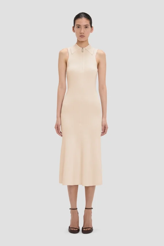 the sleeveless mira midi dress in sandstone is crafted from a tactile rib stitch and defined by a sexy front zip fastening. a modest collared neckline and midi-length hemline bring polish to the provocative detailing.