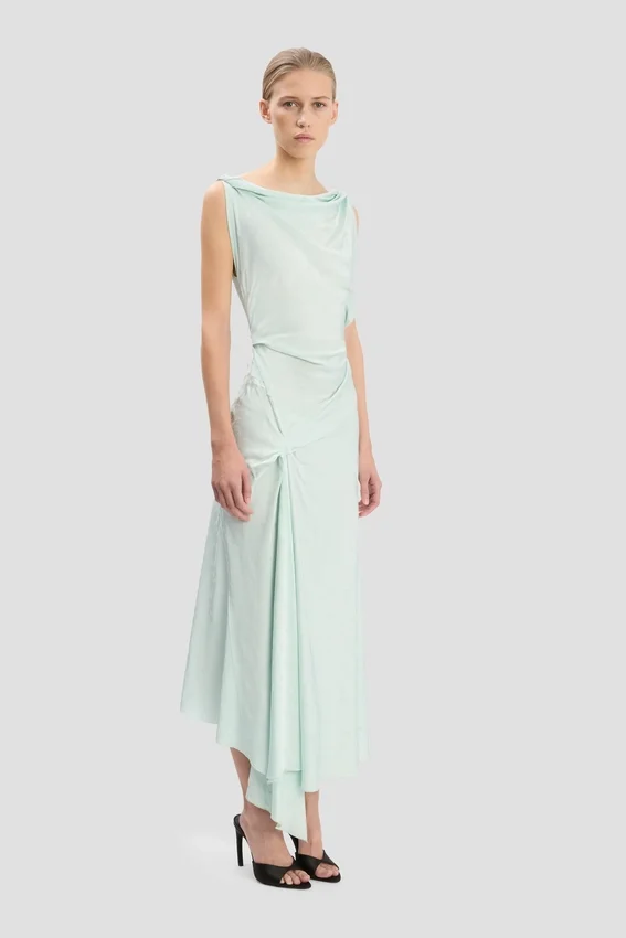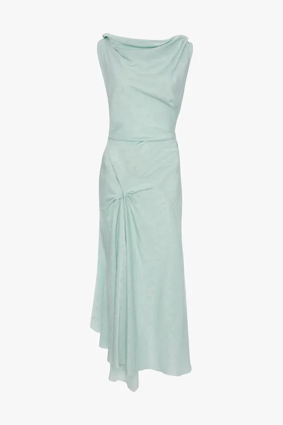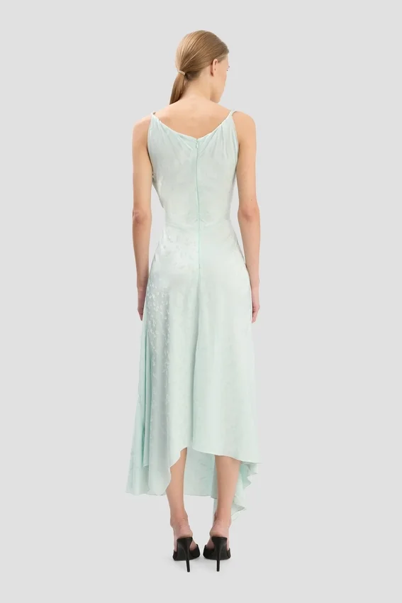 tactile jacquard adds an elevated finish to the posy midi dress in aquamarine. defined by twisted shoulder straps, an asymmetric hemline, a distinctive pleated detail at the waist and front skirt and a v shape back, it is a polished but provocative piece.