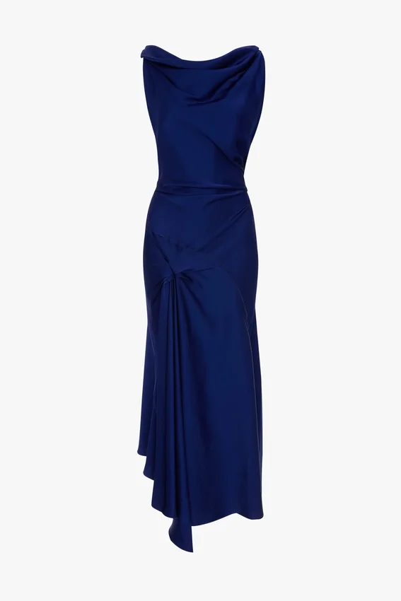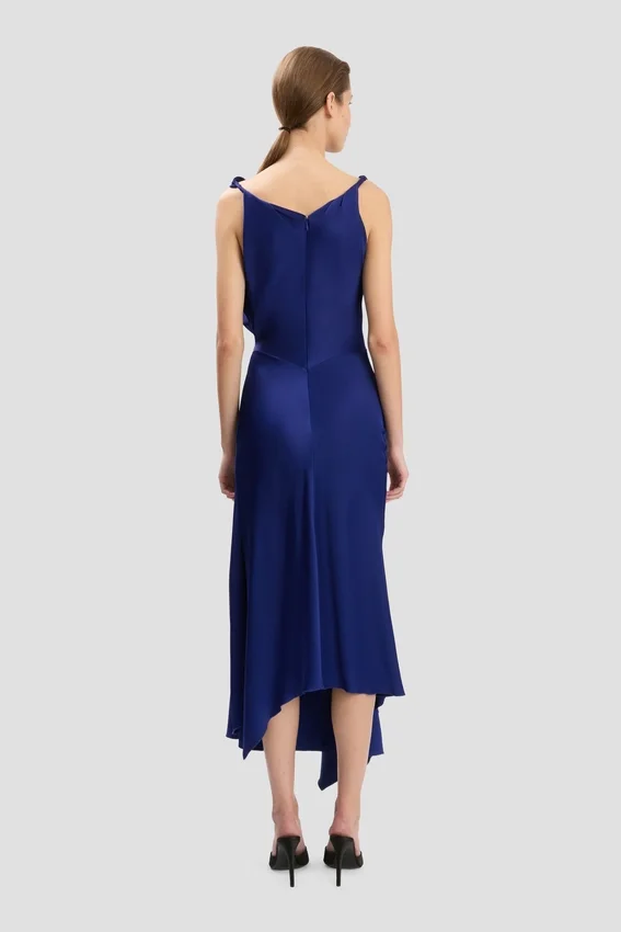 crafted from crepe back satin, the posy midi dress has twisted shoulder straps, an asymmetric hemline and a distinctive pleated detail at the waist and front skirt. a v-shape back adds a sensuous undertone, while the vibrant bright indigo colourway makes a confident statement.
