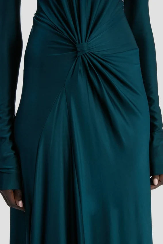 the twist waist gown’s demure silhouette is imbued with dramatic flair by virtue of a floor-pooling hemline and sensuous knotted detail at the front waist. crafted from a body-sculpting high-shine jersey, it has a side-seam split and longer-length sleeves with tactile ruching at the cuff.