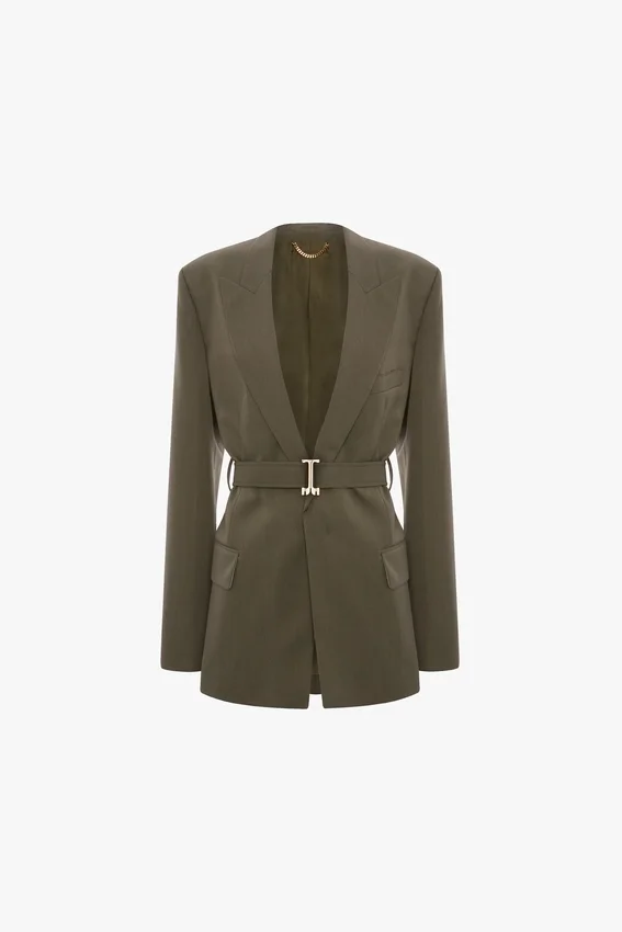 crisp tailoring is a hallmark of the victoria beckham brand and the wool-blend belted tailored jacket in sage melange brings a fresh perspective to the house’s edit. finishing below the hip, it has double back vents, front welt pockets with flaps and a single chest welt pocket. distinguished by a b belt trim, it exudes modern sophistication.