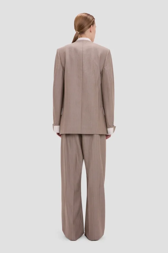 The fully lined Collarless Jacket is meticulously tailored from a light herringbone fabric and finished with a half double-breasted cut. Defined by its collarless neckline and oversized shoulder, it is seat length and is presented in a versatile Limestone colourway.