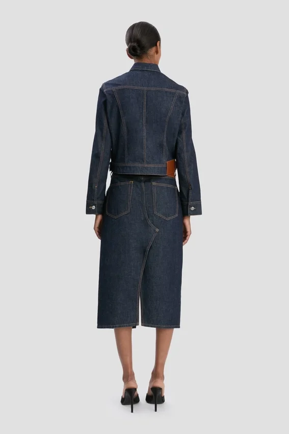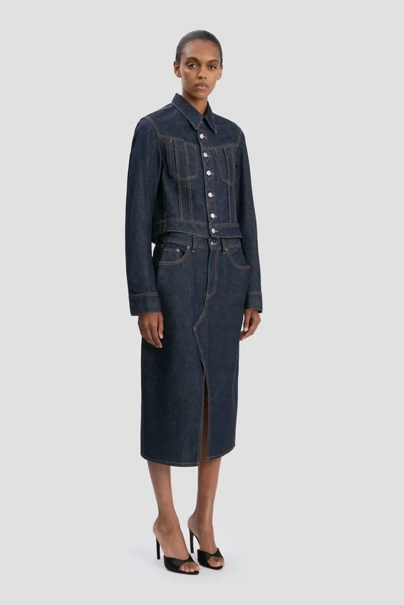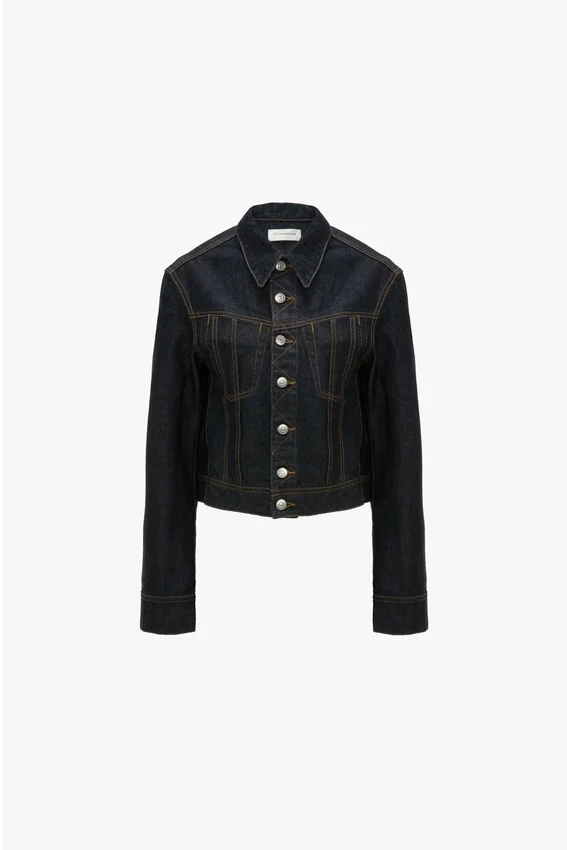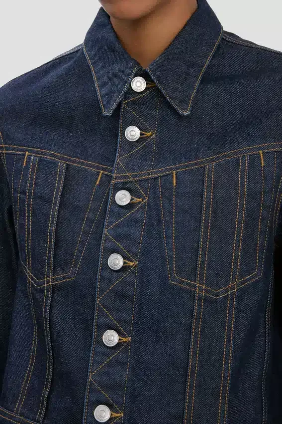 the denim jacket in light rinse plays with silhouette proportions, contrasting extra-long sleeves with a cropped hemline. designed with a neat fit, it has a traditional collar and front placket fastening, branded denim shank buttons and tobacco topstitching. crafted from a non-stretch, mid-weight denim, it blends masculine and feminine references for a fresh take on a wardrobe classic.
