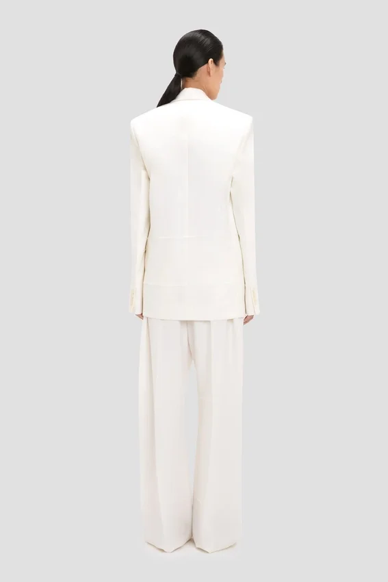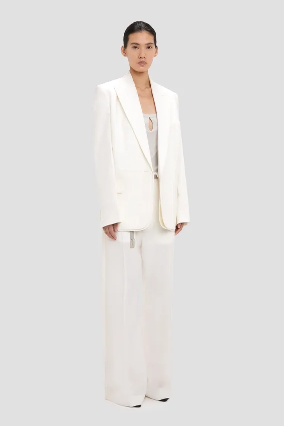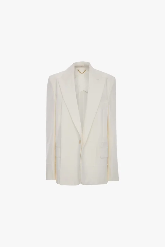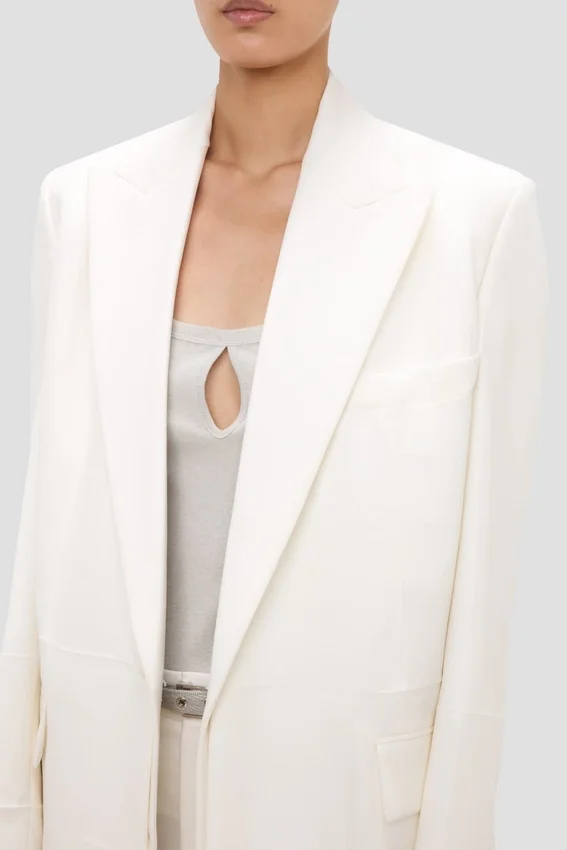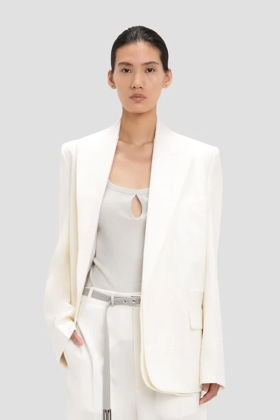 a deconstructed take on traditional tailoring, the detached lapel jacket in off-white has a single-breasted cut, oversized shoulders and a seat-length hemline. discreet detailing on the jacket melton adds the house’s signature finesse, while flap pockets bring a traditional finishing touch.