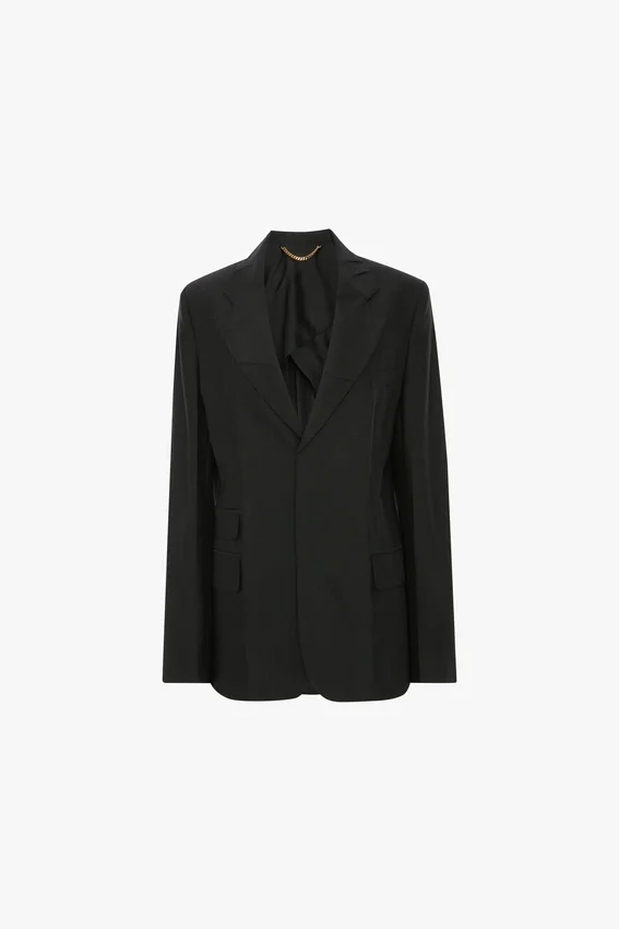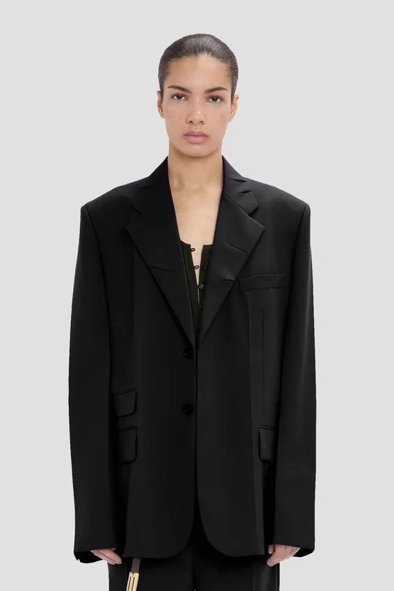 with a single-breasted cut, seat-length hemline and regular shoulder, the notched lapel jacket in classic black has a sleek silhouette. closed splits on each sleeve and discreet detailing on the jacket melton reflect the house’s signature flair, while butterfly lining and flap pockets complete the look.